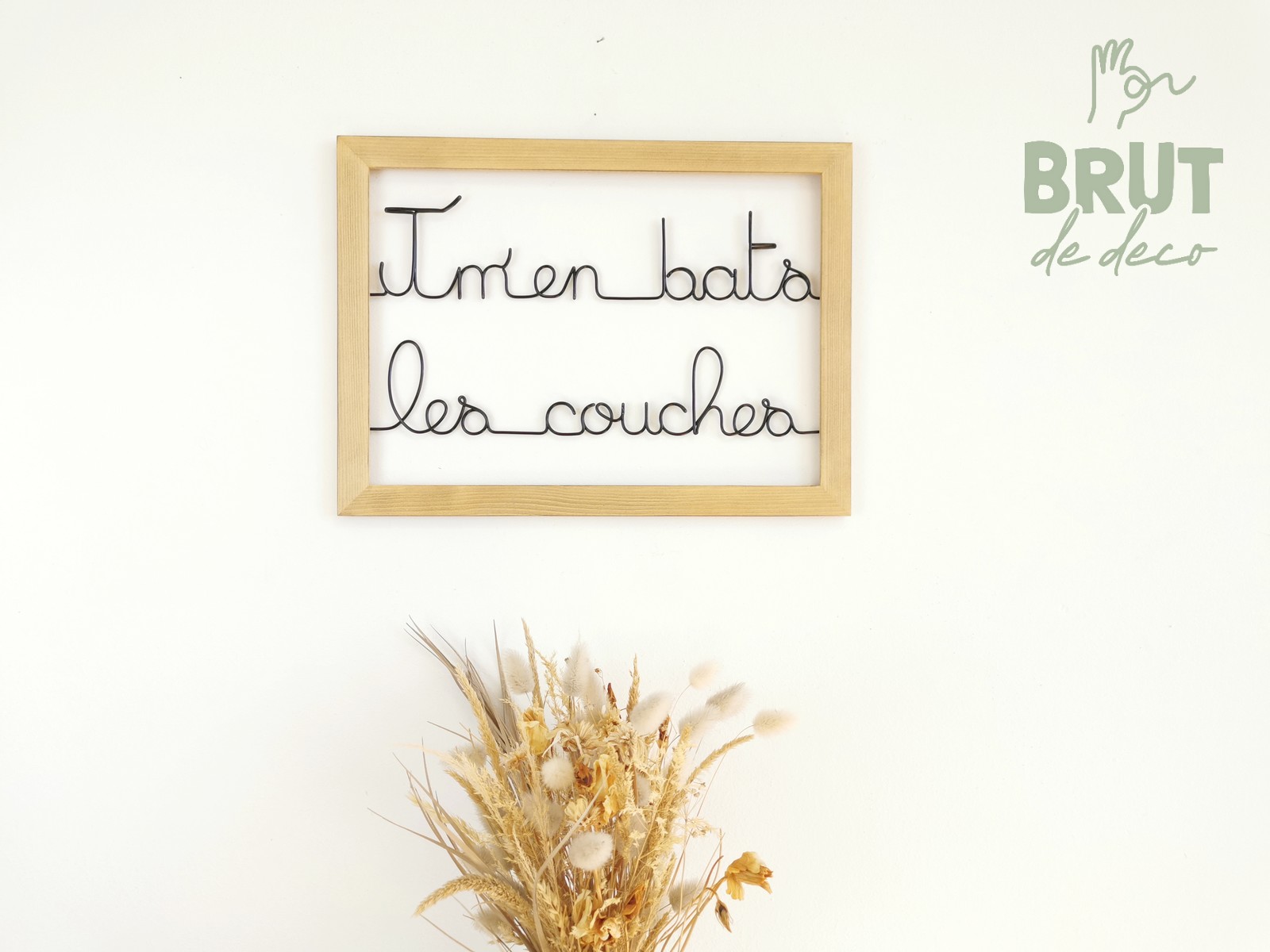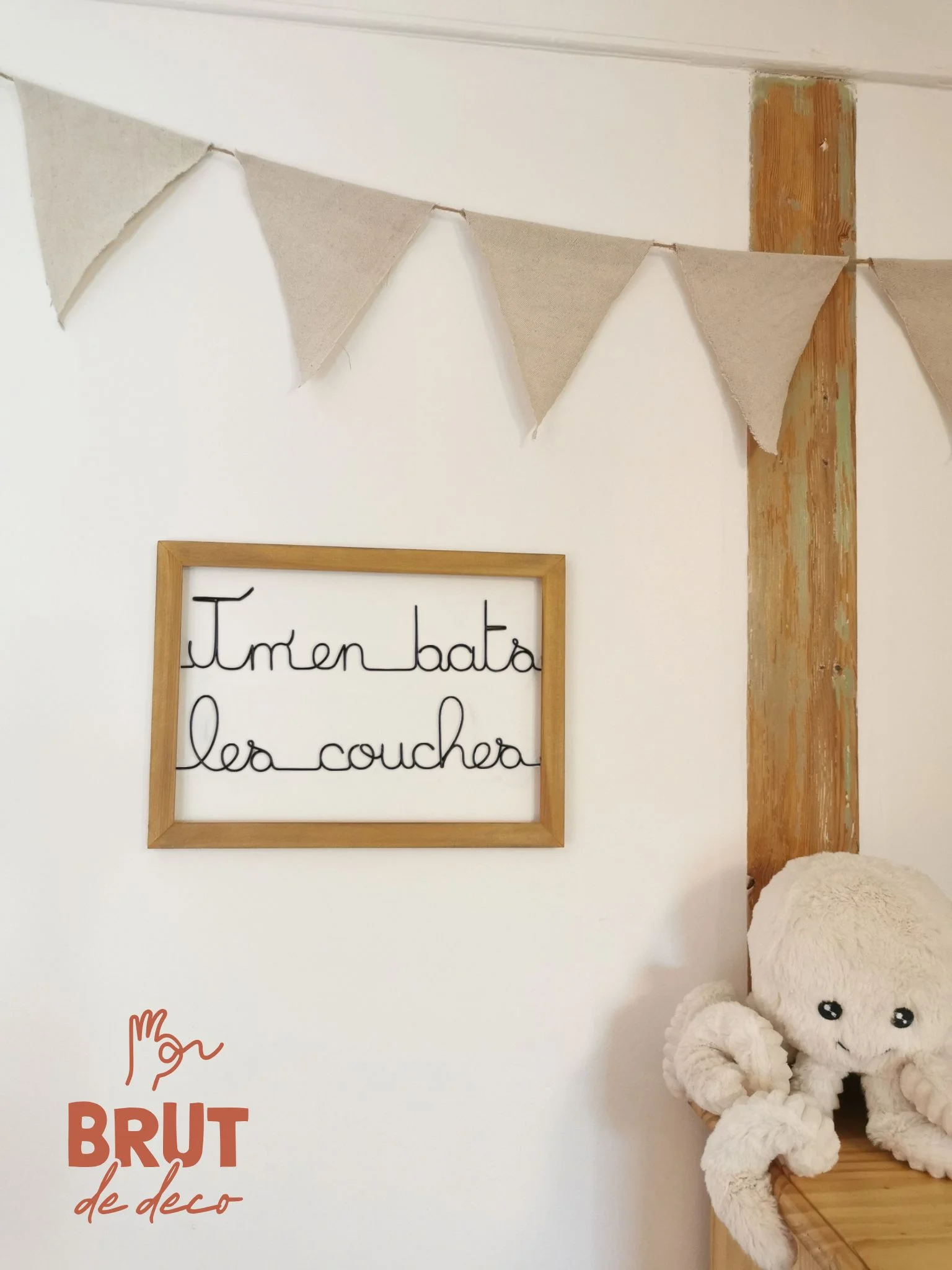 Le cadre est en pin brut que j’ai légèrement teinté et cérusé pour en faire ressortir les veines. Il n’a ni fond ni vitre pour un stylé épuré et minimaliste.