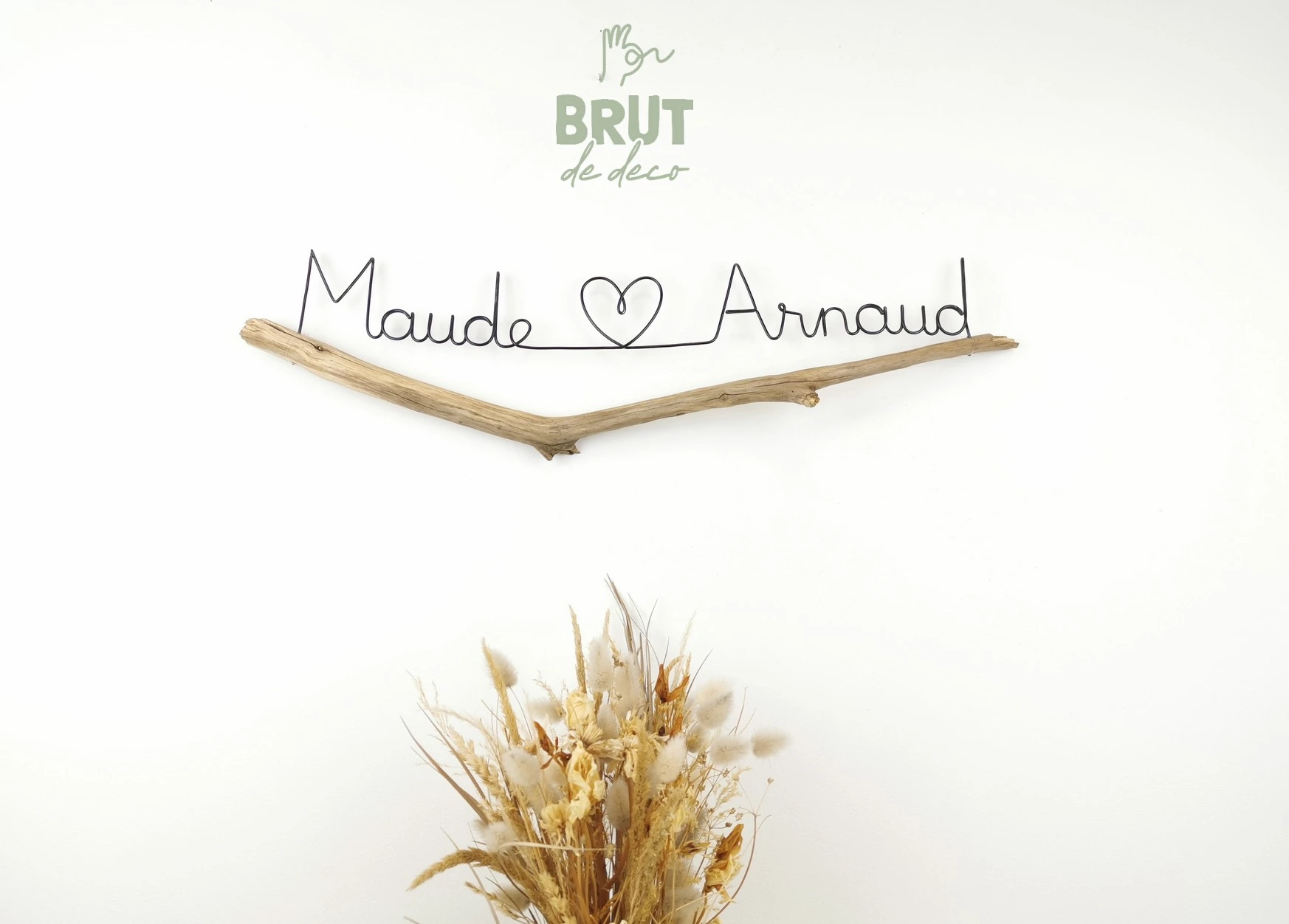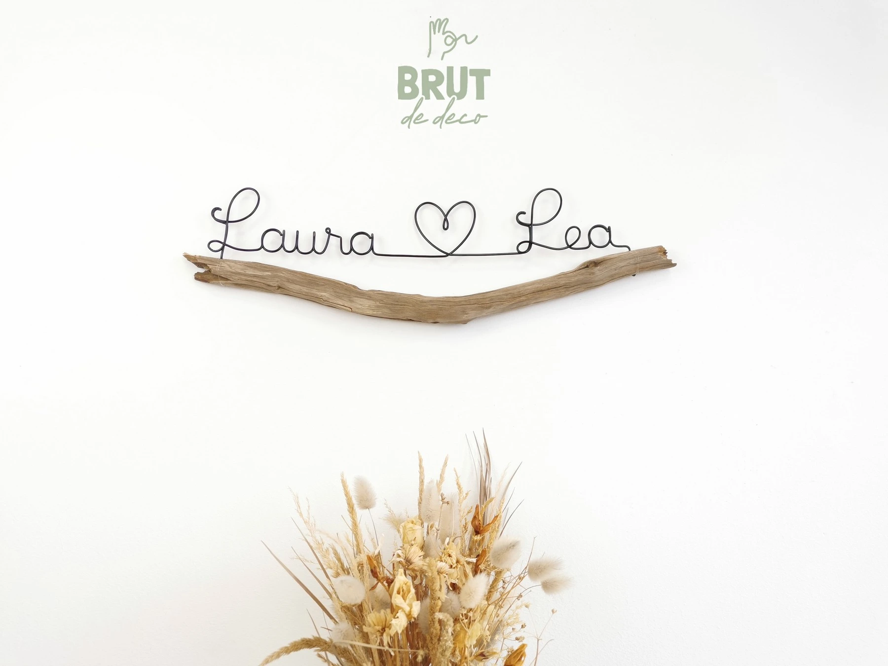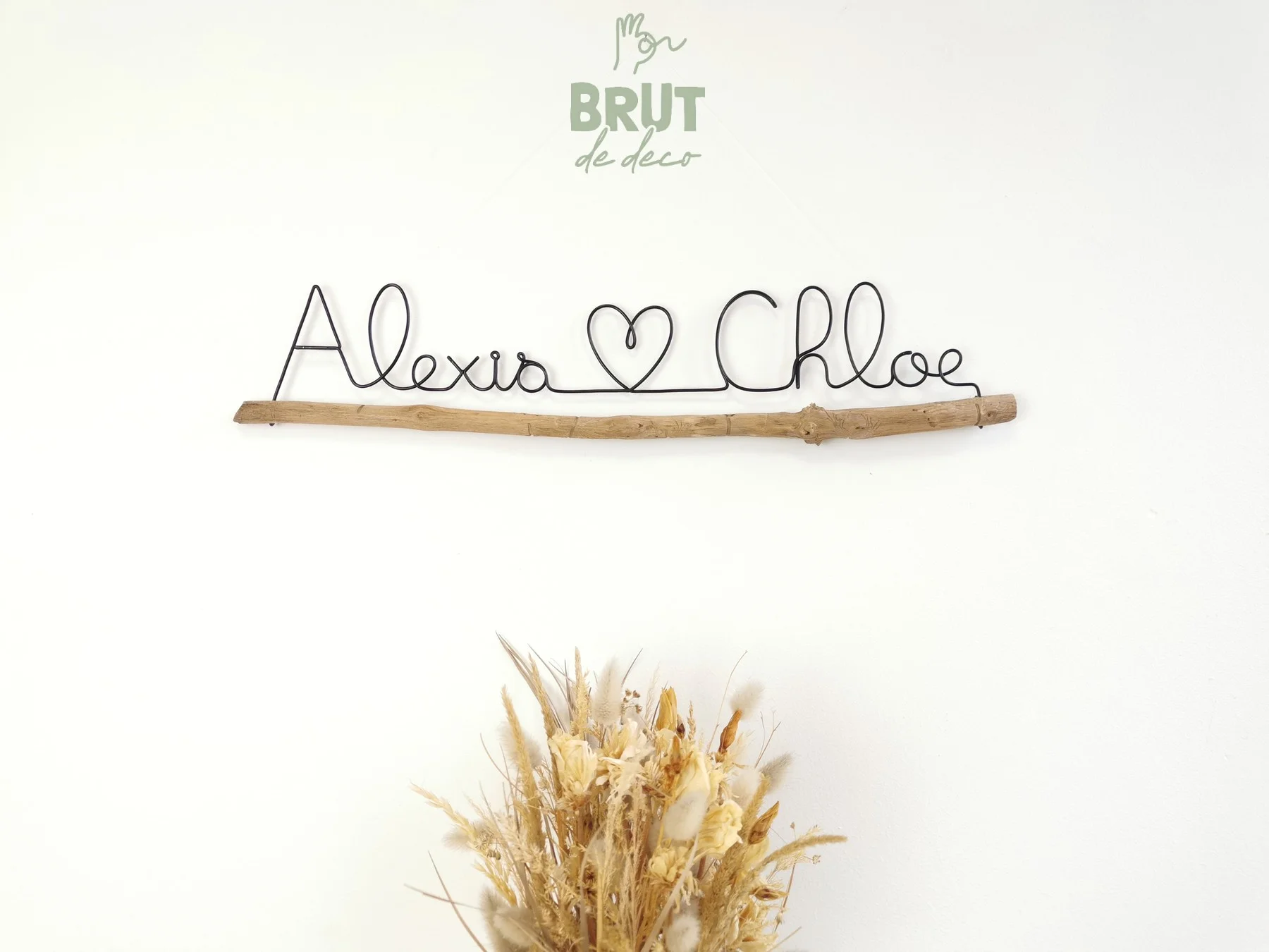 La branche est en bois naturel. L’essence dépend de ce que j’ai à l’atelier. J’adapte les branches en fonction des prénoms pour avoir une harmonie de forme entre les deux.