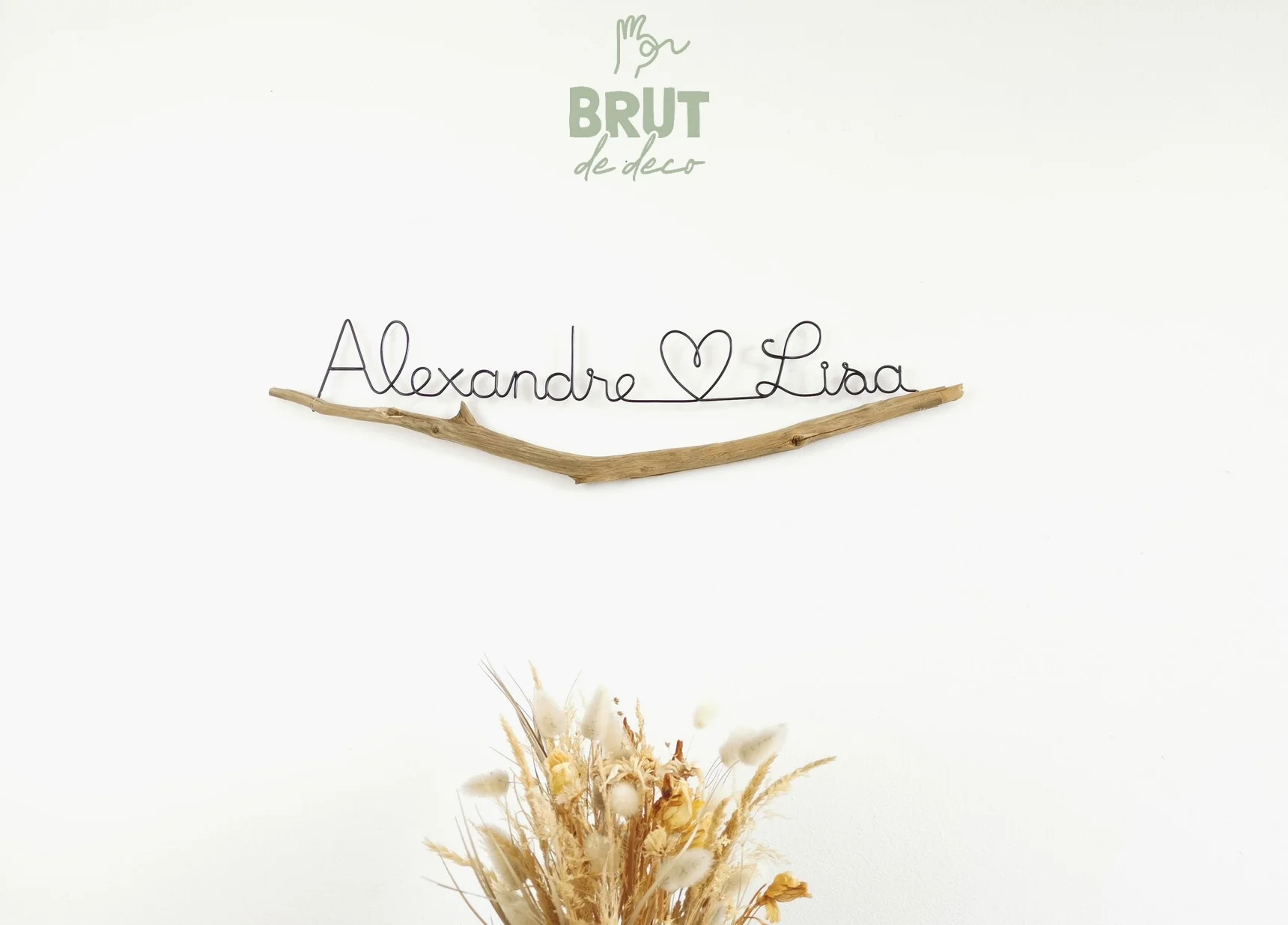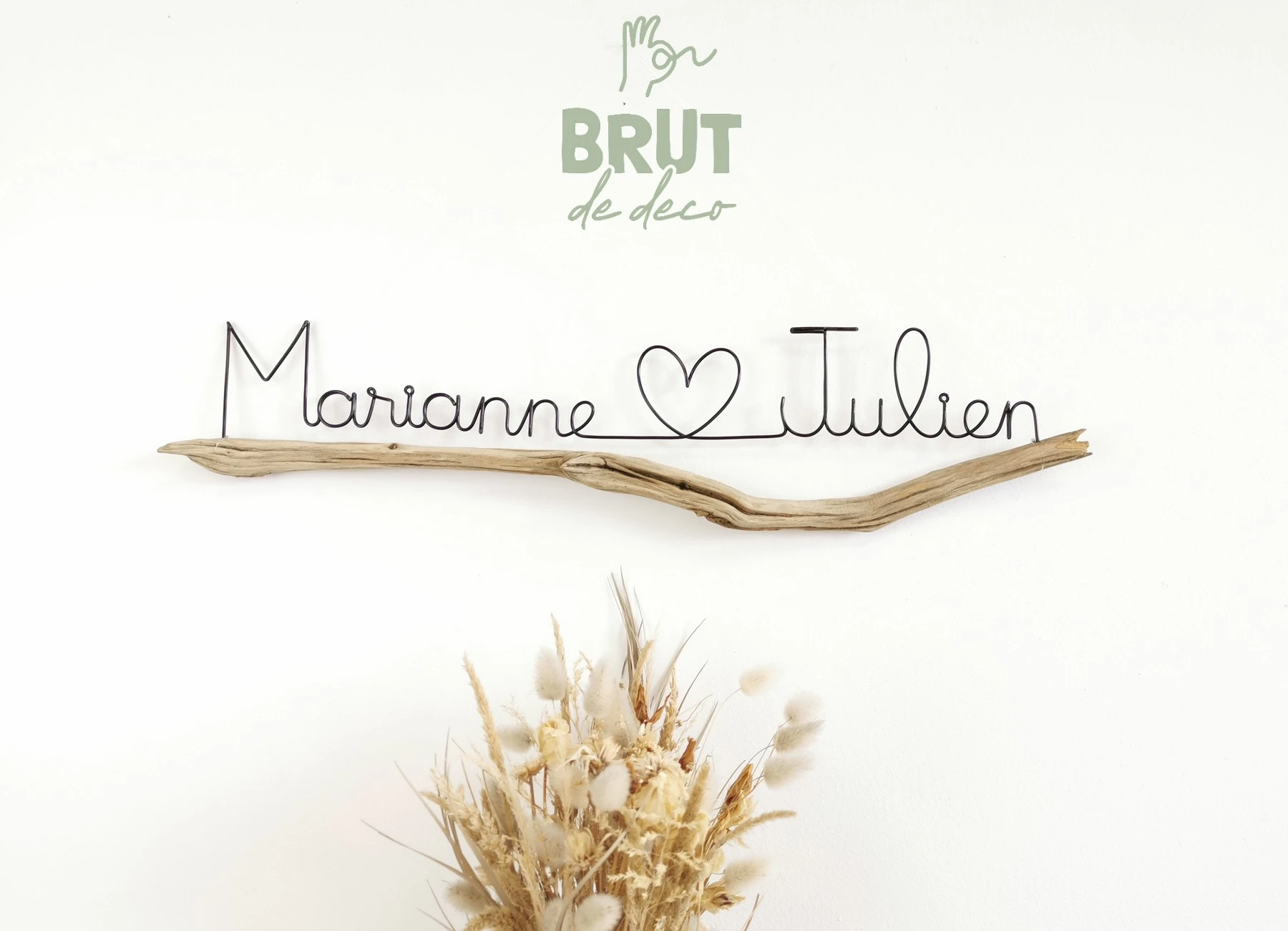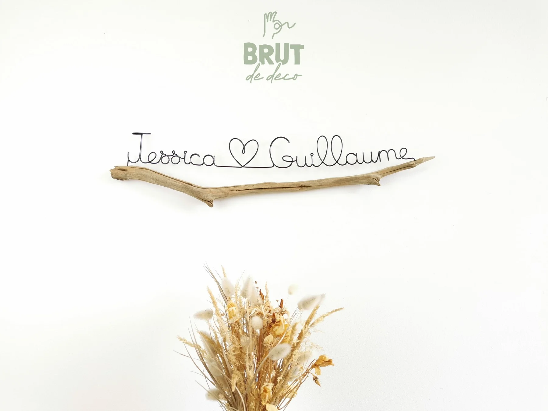 La branche est en bois naturel. L’essence dépend de ce que j’ai à l’atelier. J’adapte les branches en fonction des prénoms pour avoir une harmonie de forme entre les deux.