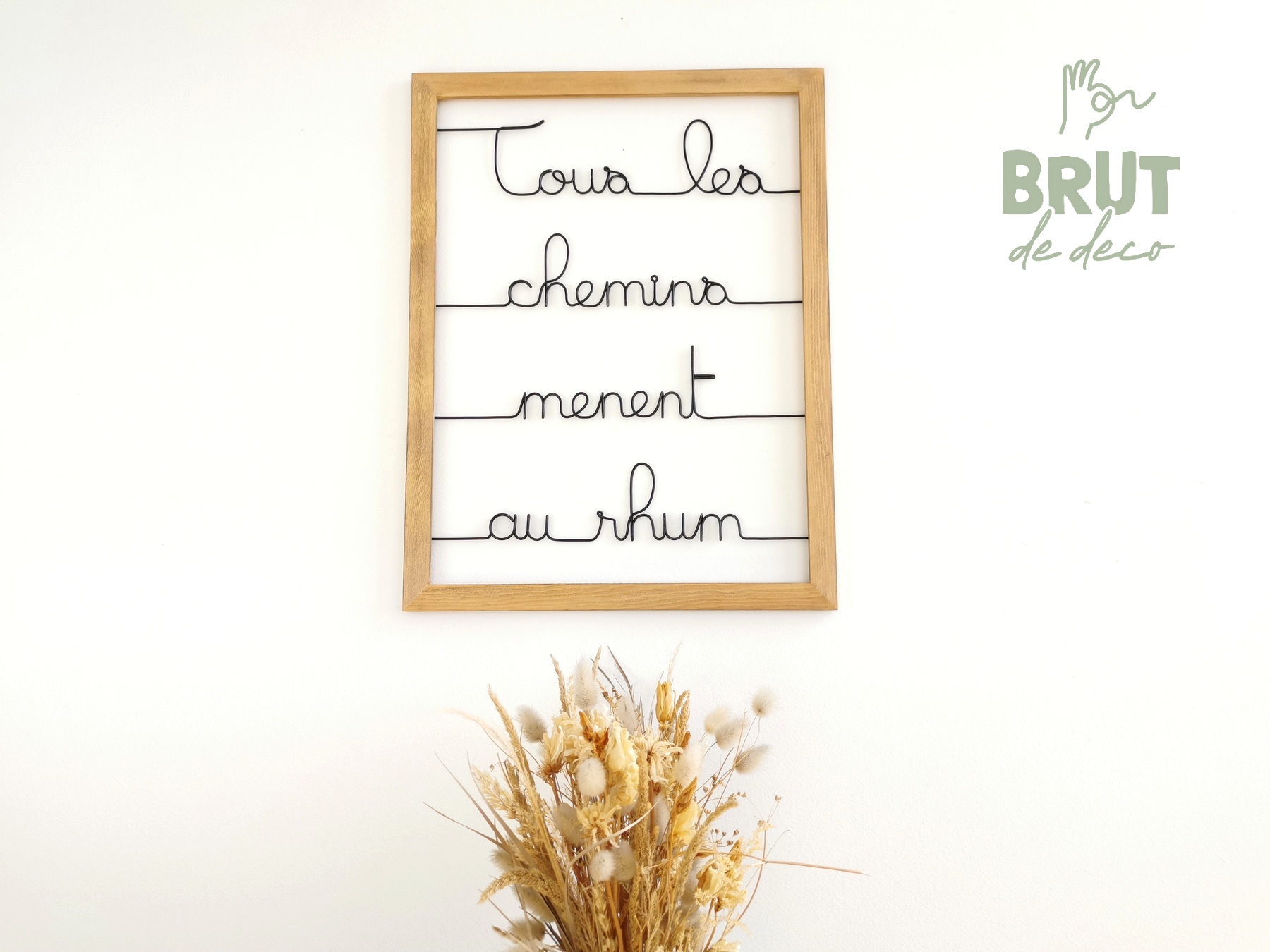 Le cadre est en pin légèrement teinté et cérusé à la main pour faire ressortir les veines. Il n’a ni fond ni de vitre, donc on évitera les papiers peints à motifs en fond si on veut pouvoir lire “au rhum”!